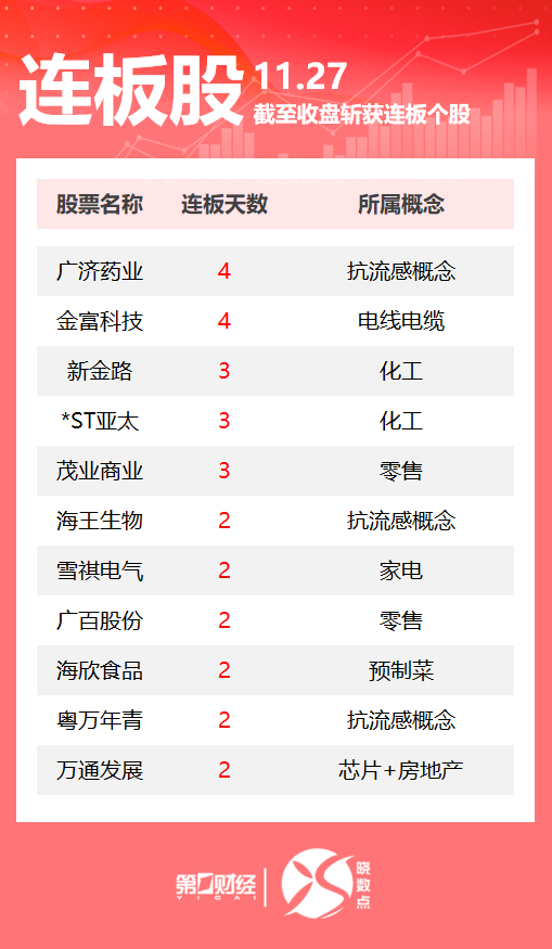 连板股追踪丨A股今日共63只个股涨停 抗流感概念多股连板(2025/11/27)