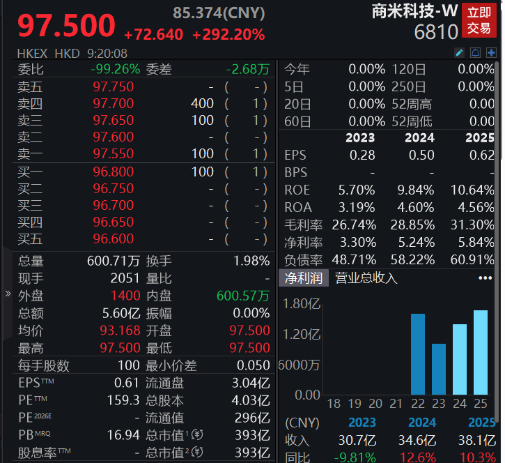 商米科技港股上市首日高开超290%,公开发售阶段获逾2000倍超额认购(2026/04/29)